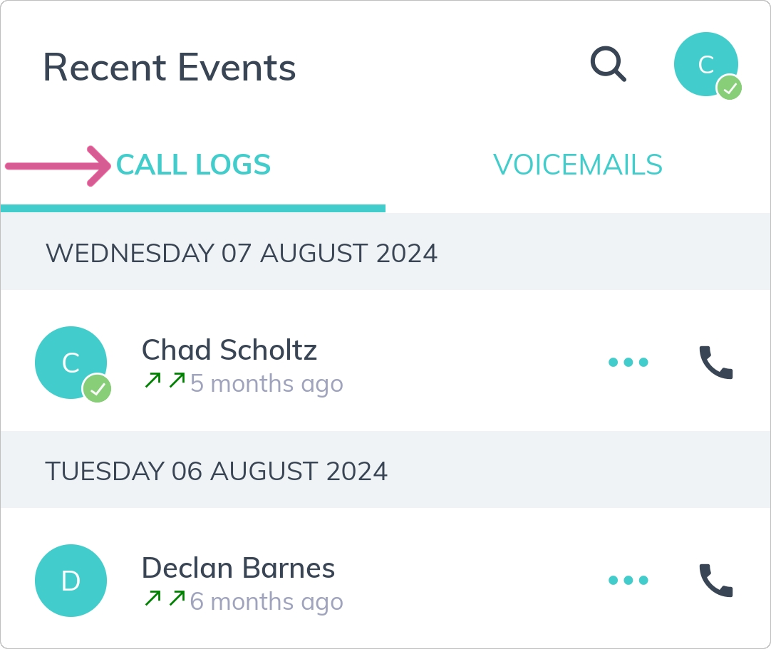 2. Your 'Call logs' will display all incoming, outgoing, and missed calls.