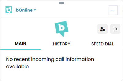 Open the bOnline phone for the HubSpot app by clicking the phone icon in the top-right corner of the screen and entering your bOnline phone CRM add-on credentials. The app must have been opened on at least one tab for the incoming call functionality to work.