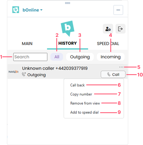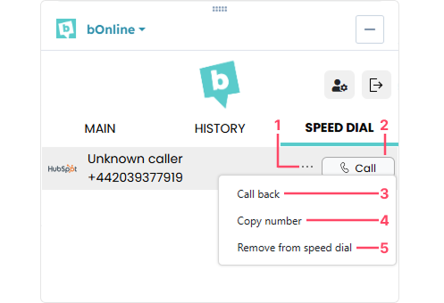 Remove from speed dial: remove contact/company from speed dial. This can also be done from the History tab.