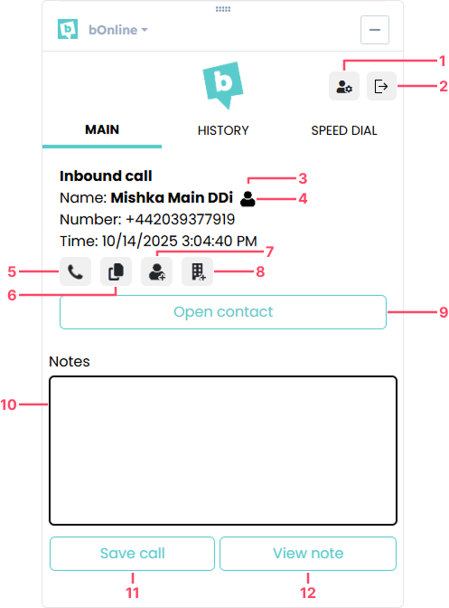 The Main tab is the screen that is shown when initially opening the bOnline phone for HubSpot app. When receiving or making a call, multiple functions become available to the user, which are listed below.
